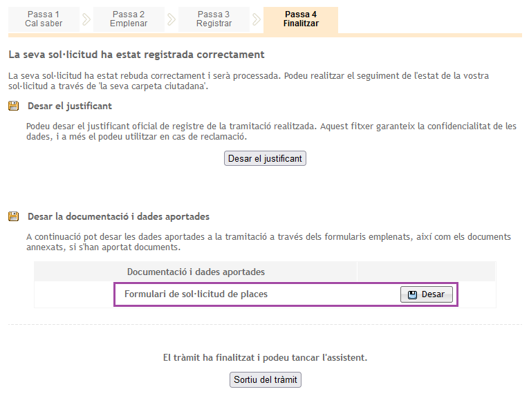 És important que gaurdis la sol·licitud, ja que és l'únic justificant que tendrem en cas de tenir algun problema més endavant. Malauradament, la carpeta ciutadana només et permet recuperar el justificant d'enviament, no la sol·licitud. Per guardar una còpia de la sol·licitud ho hem de fer just després d'enviar el tràmit.