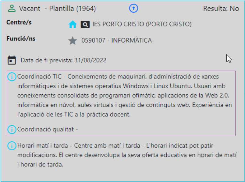- Cessament a 31 d'agost de 2025, si no és que una persona amb més drets administratiurs (personal funcionari de carrera) accedeixi a la plaça. En aquest cas, perdem la plaça i hem de tornar a triar amb el que quedi.