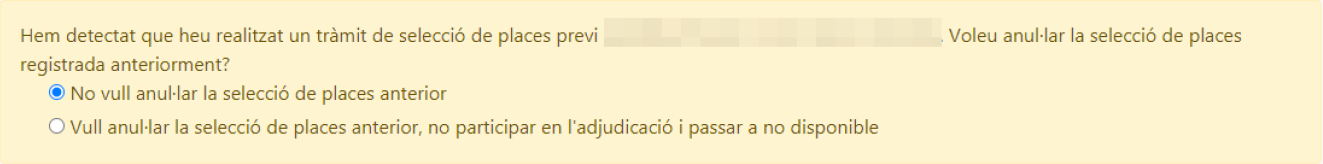 Si ja has fet un tràmit però finalment decideixes que vols no participar i quedar com a no disponible, hauràs de tornar a fer el tràmit i seleccionar l'opció "Vull anul·lar la selecció de places anterior, no participar i passar a no disponible".