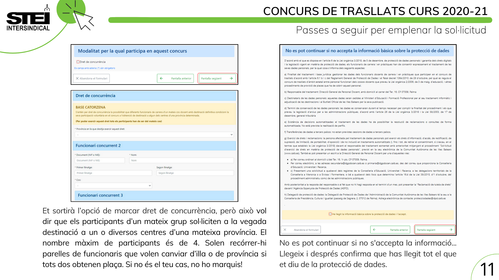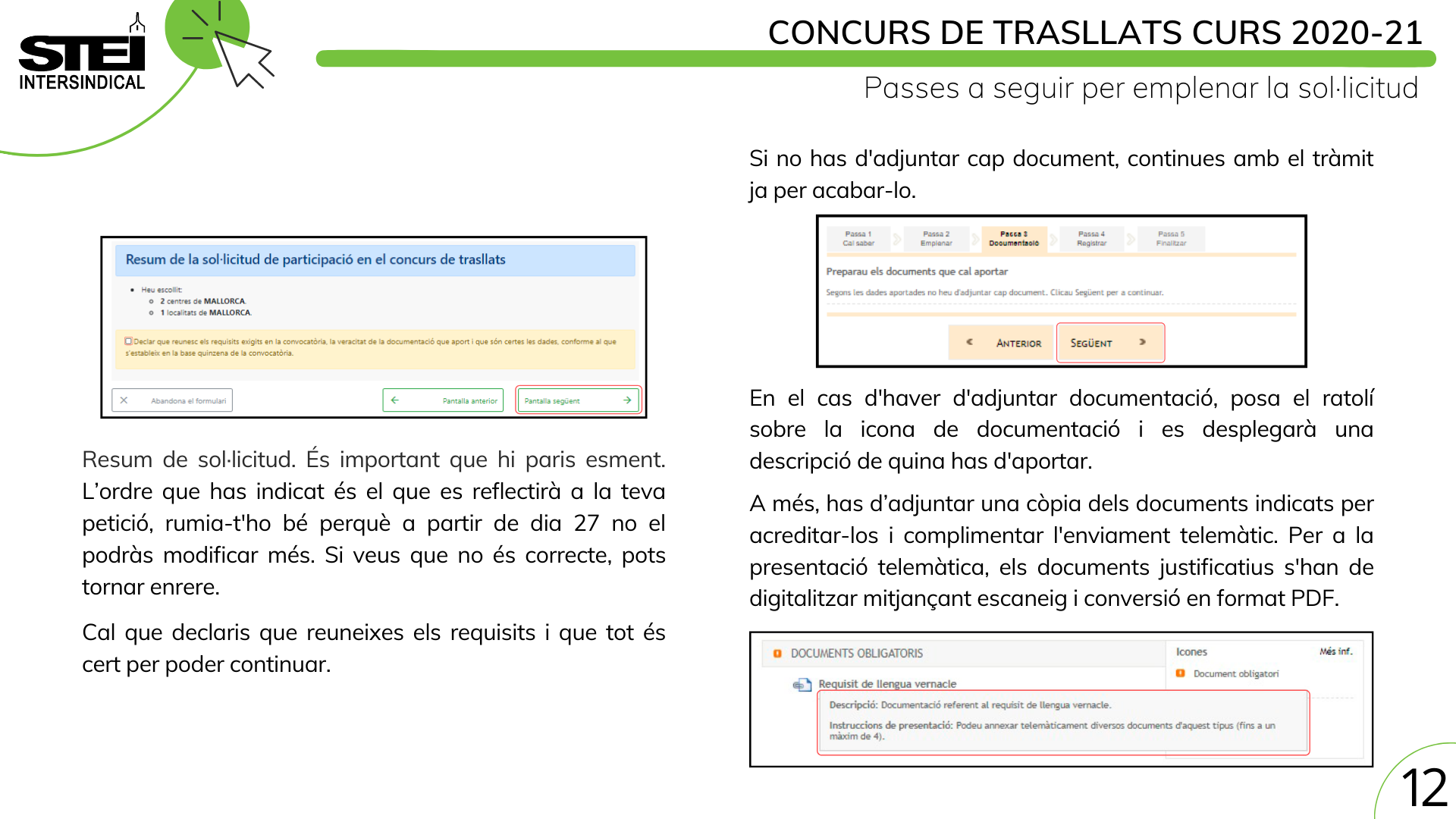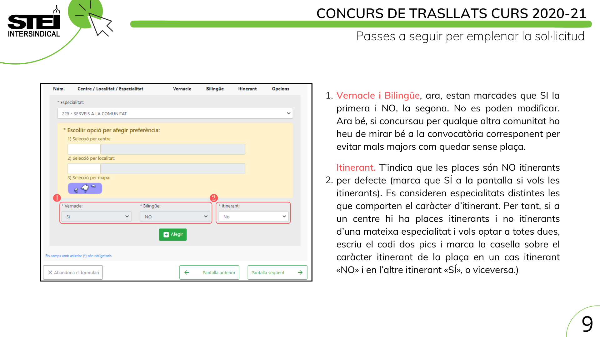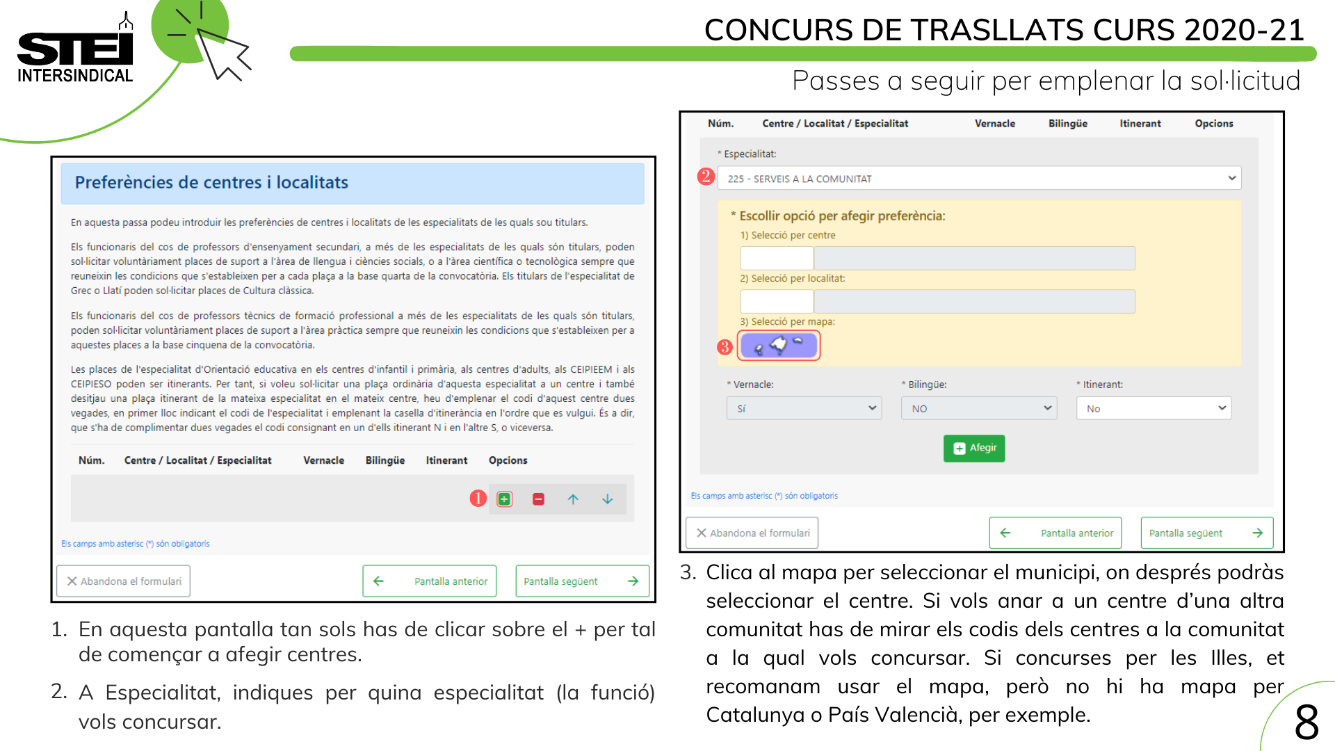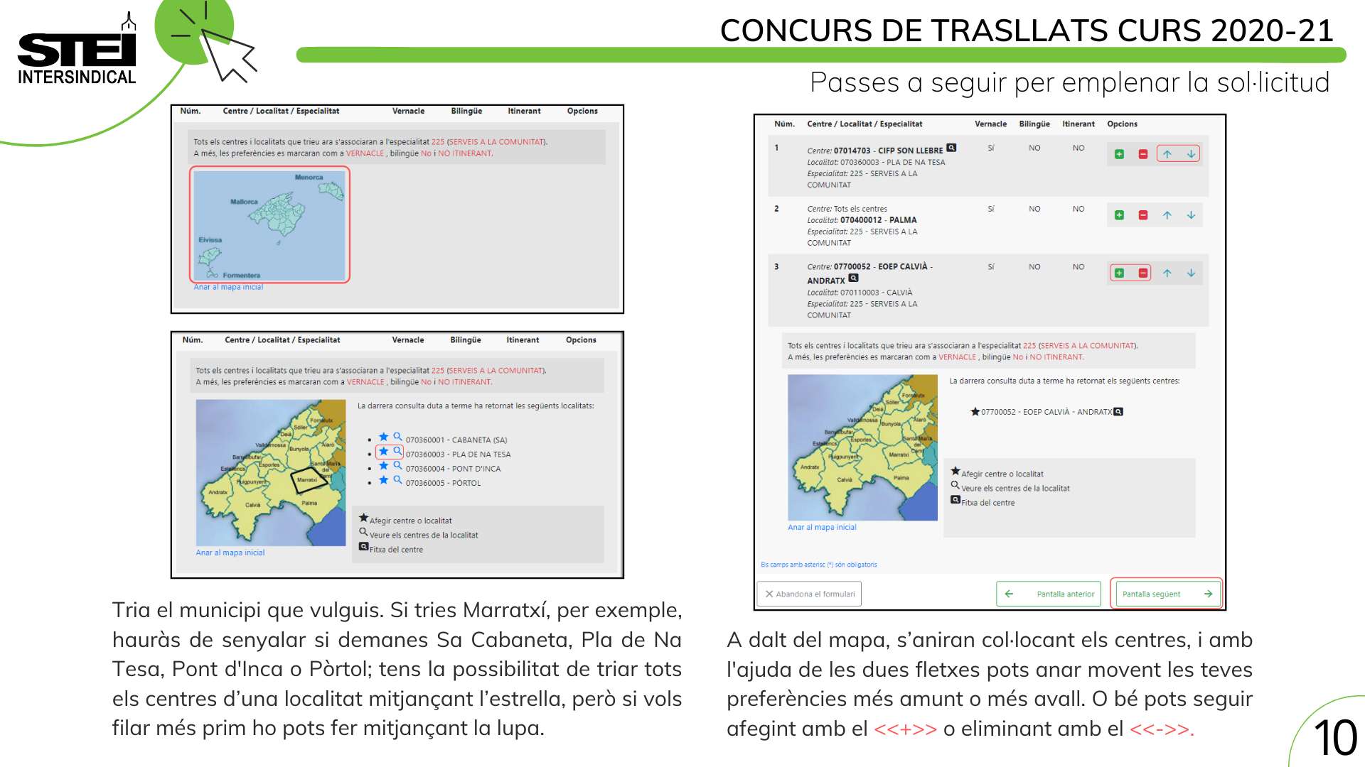 No ho pots saber quan concursis i, per tant, ho hauràs de fer «a cegues». Quan el tràmit del concurs s’hagi tancat, la Conselleria ordenarà que es publiquin aquestes vacants abans de la resolució provisional del concurs, però aleshores tu ja no seràs a temps d’introduir cap canvi. Val a dir que és una reivindicació històrica de l’STEI Intersindical poder-les conèixer amb anterioritat.