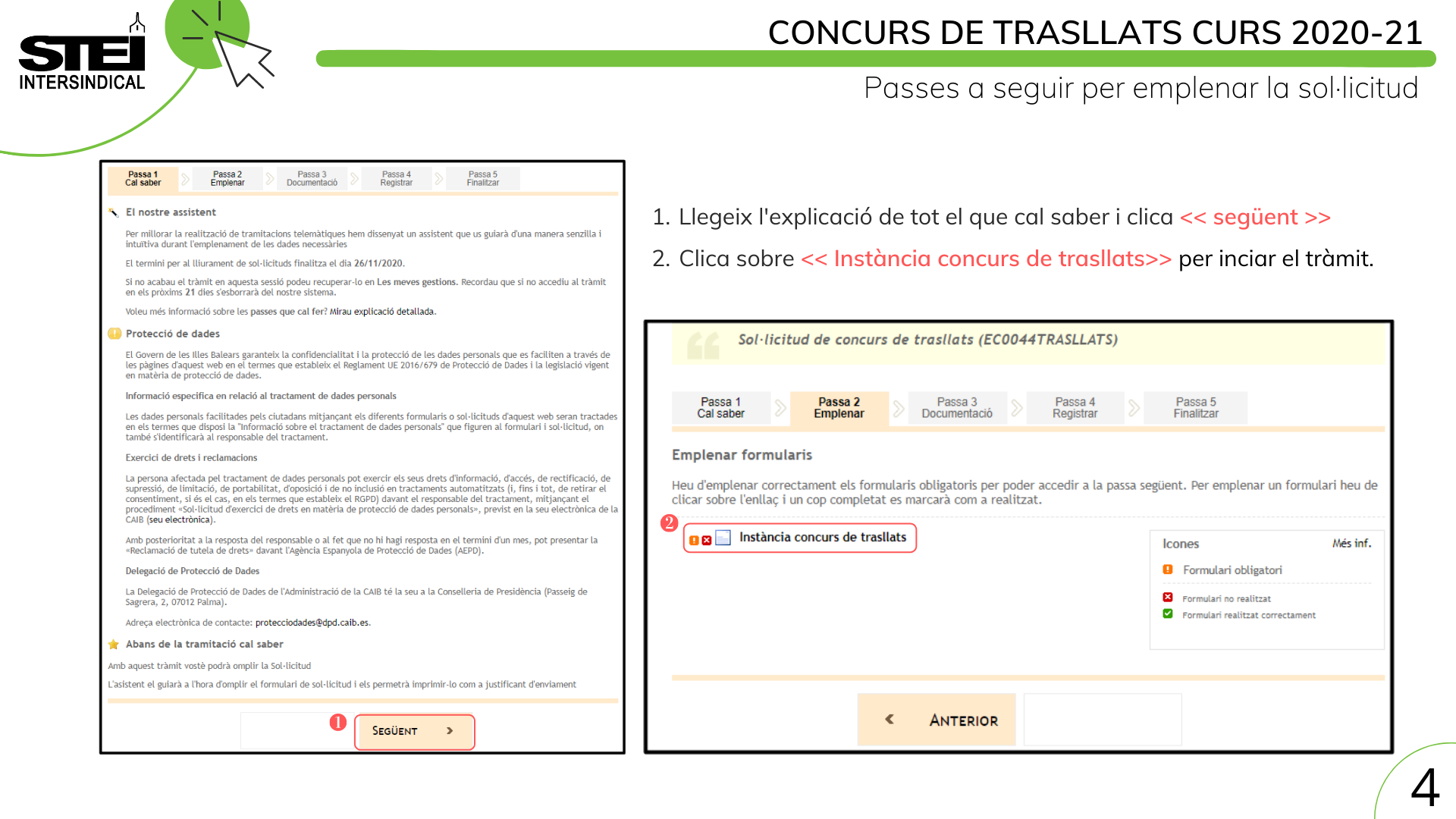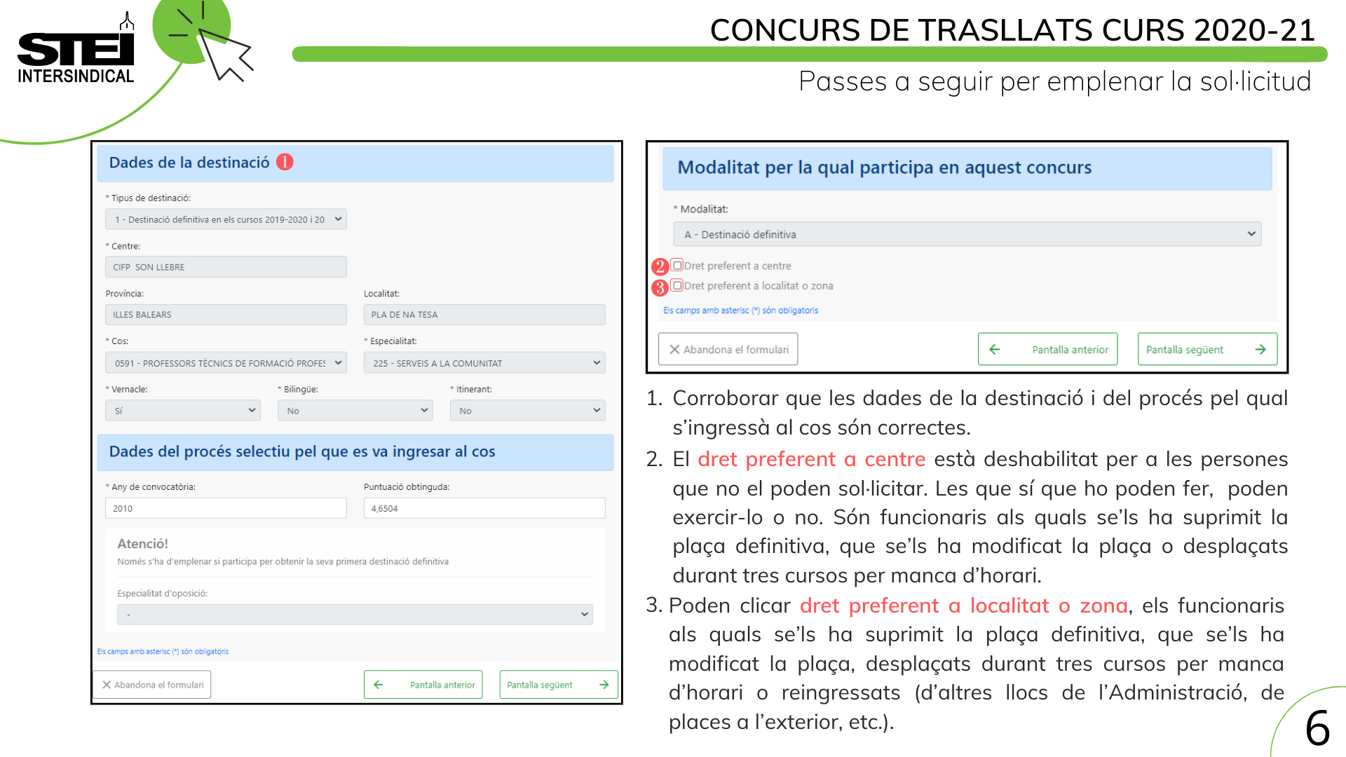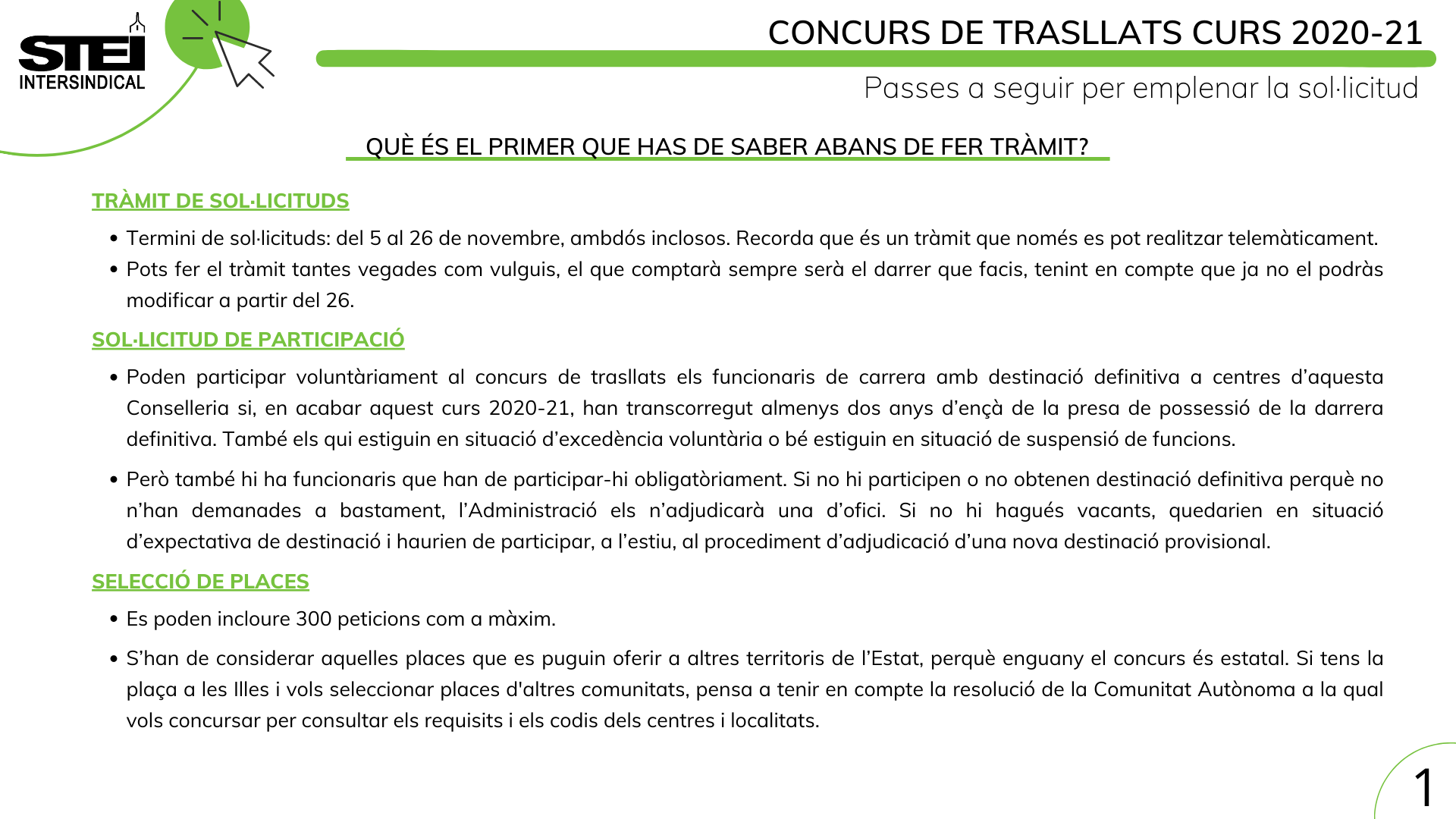 Per poder participar en la convocatòria de comissions de serveis per enguany, llevat dels casos que la comissió de valoració que es creï per a aquesta convocatòria pugui considerar excepcionals, serà requisit haver sol·licitat una plaça en el concurs de trasllats per a la localitat o localitats on se sol·liciti la comissió de serveis, i no haver desistit a la provisional. Per a més informació, consulta el nostre web o telefona’ns a l’STEI.