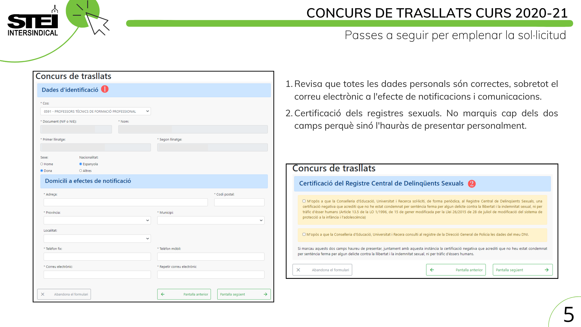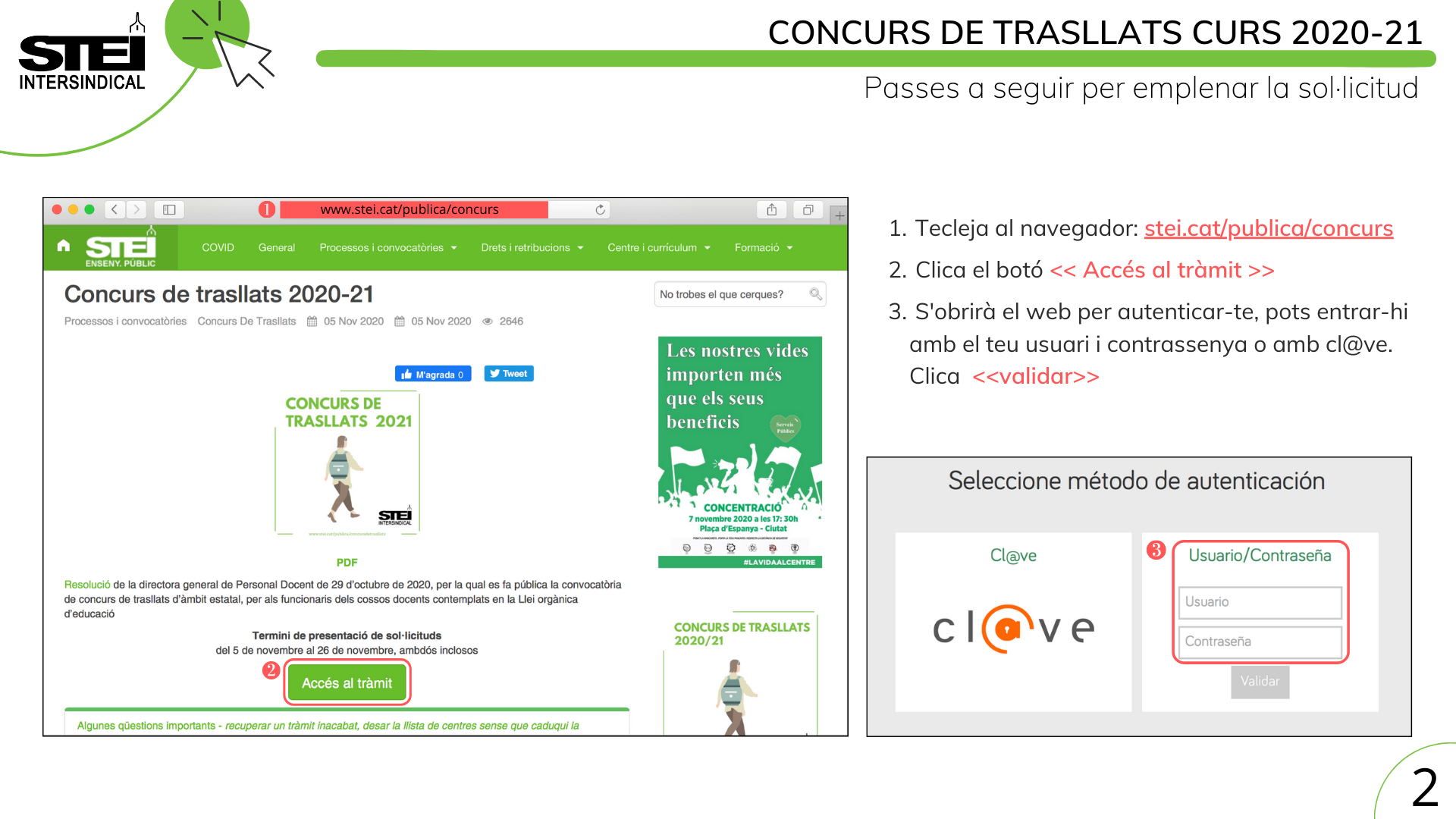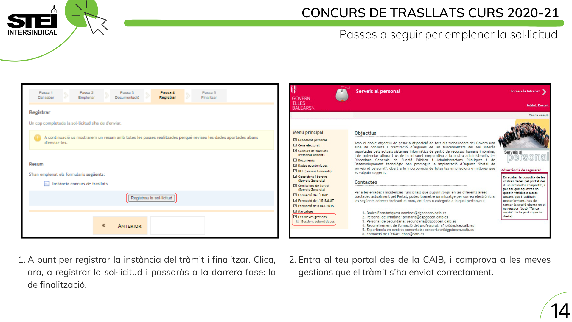 Per poder participar en la convocatòria de comissions de serveis per enguany, llevat dels casos que la comissió de valoració que es creï per a aquesta convocatòria pugui considerar excepcionals, serà requisit haver sol·licitat una plaça en el concurs de trasllats per a la localitat o localitats on se sol·liciti la comissió de serveis, i no haver desistit a la provisional. Per a més informació, consulta el nostre web o telefona’ns a l’STEI.