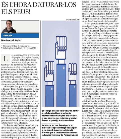 Avui dimecres, els sindicats convocants del sector de l’ensenyament públic STEI Intersindical, FETE-UGT, ANPE i FECCOO formalitzen les convocatòries de les jornades de vaga autonòmica del sector d’ensenyament previstes per al proper 13 i 20 de març. Així mateix, s’ha comunicat a l’administració que la jornada de vaga de dia 13 anirà acompanyada d’una concentració a les 12h davant la Conselleria d’Educació i les seves respectives delegacions territorials de Menorca i Eivissa.