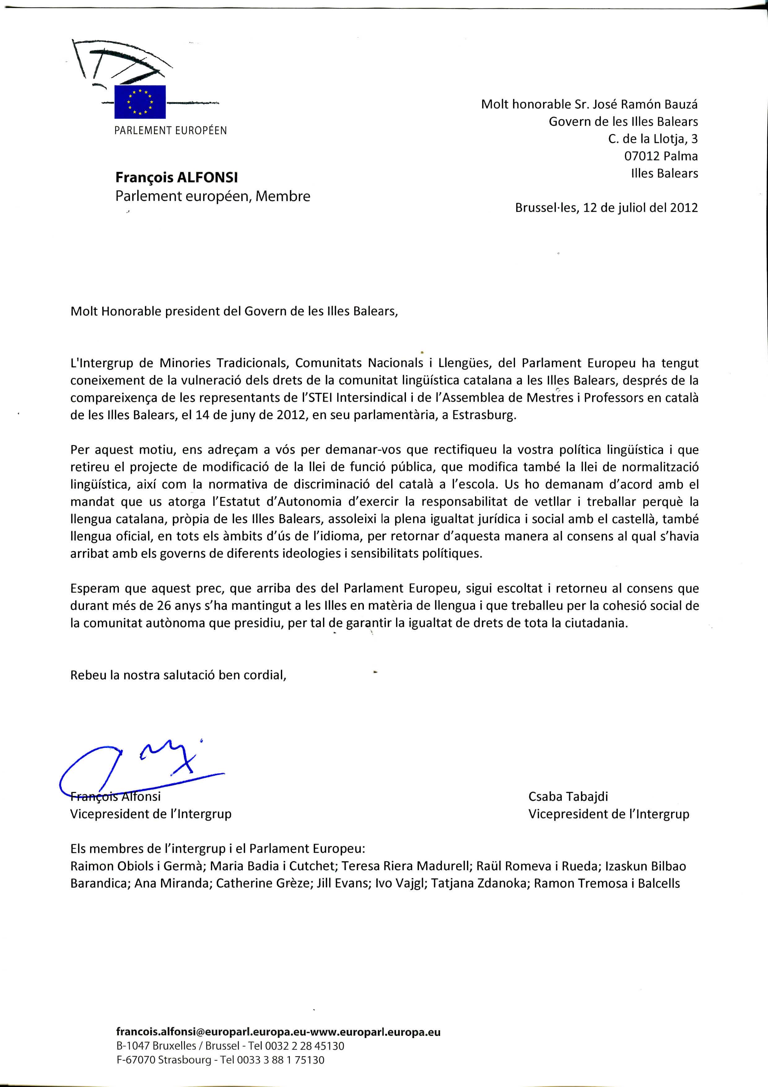 Carta de l'Intergrup (Parlament Europeu) al President Sr. José Ramón Bauzá